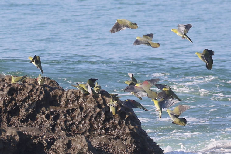 アオバトは、20~30 キロメートル離れた丹沢山地から飛来し、群れを作って飛び回り、岩場に降りて窪みに溜まった海水にくちばしを浸けて、吸い込むように飲みます。