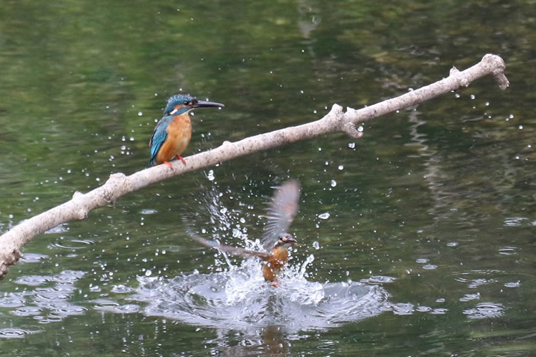 珍しく、親(成鳥)2 羽が同じ枝に止まったと思ったら、1 羽が水浴びを始めました。