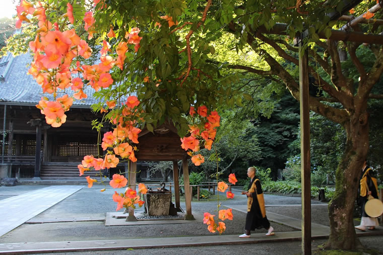 早朝の光を浴びて、ノウゼンカズラの花が透けるような鮮やかさで、そこに朝のお勤めのお坊さんが現れました。