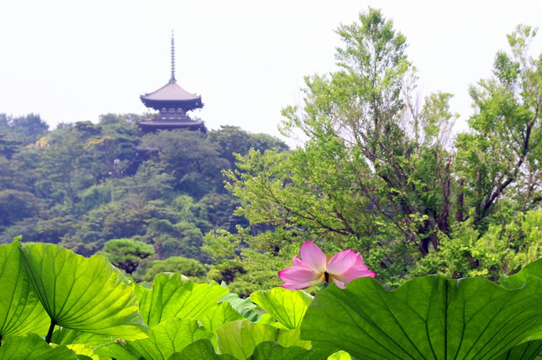 三重塔を背景にしたハスの花を撮ることができるスポットが人気です。