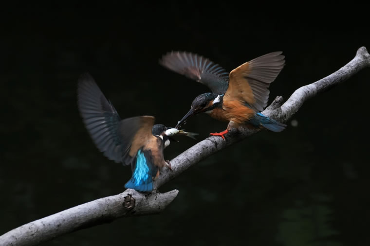 お母さんカワセミ(右)から魚をもらい、大喜びの幼鳥さん(左)です。