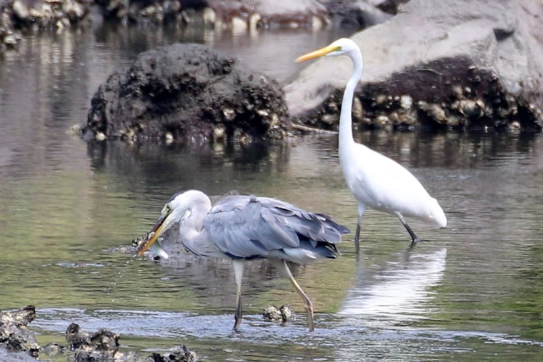 先に陣取っていたアオサギが、獲物を見つけ、すばやく咥えました。