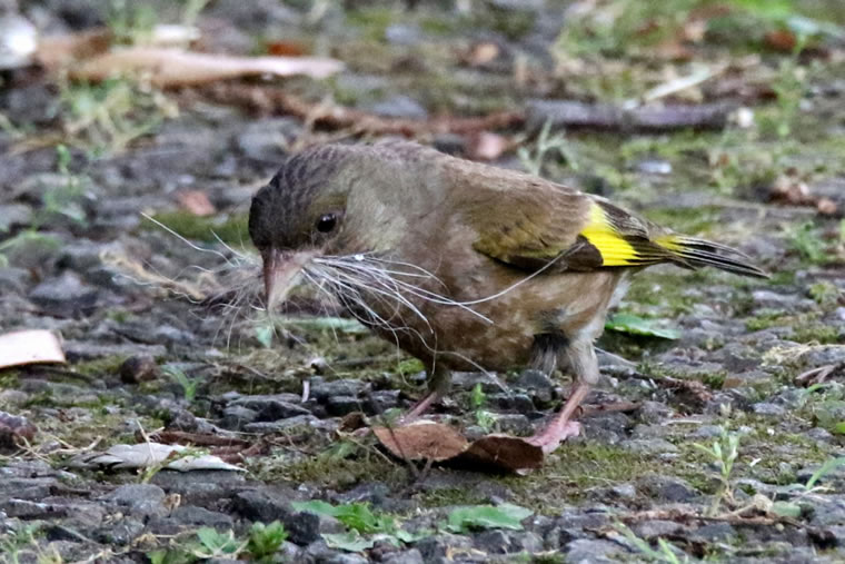 見た瞬間、「えっ! 髭がはえた鳥がいる!」 と驚きましたが、カワラヒラが巣作りのために、犬の抜け毛を集めていたようです。