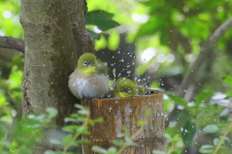 この日は、メジロ兄弟は仲良く交代しながら水浴びをしていました。