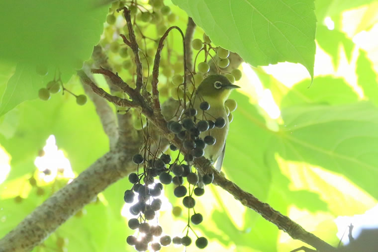 メジロ、イイギリの葉、イイギリの実、それぞれのグリーンが綺麗でした。