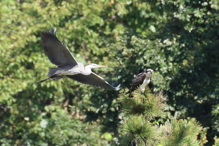 ミサゴが獲物を狙っていると、頭上をアオサギが通過しました。
