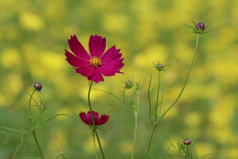 背景の黄色は、レモン色のレモンブライトというコスモスです。