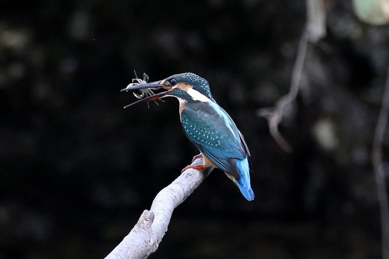 カワセミは普段は小さな魚を捕っていますが、このときはカニを咥えてきました。