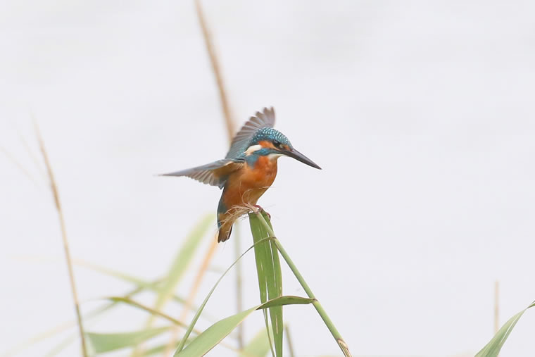 さっきまでノビタキが止まっていたススキの葉に、今度はカワセミが止まりました。
