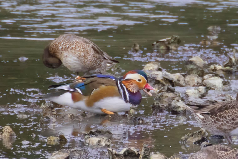 メスは、見た目は他のカモに似ていて地味ですが、オス(全長約45cm)はあでやかな彩りです。