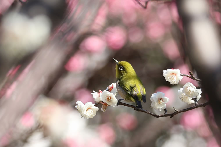 近くに紅梅も咲いていたので、メジロが逃げないように、そっと回り込み、バックに紅梅を取り込むことができました。
