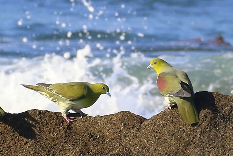 5月に神奈川県大磯駅から近い“照ケ崎(テルガサキ)海岸”にアオバトを撮りに行きました。左がメス、右がオスです。