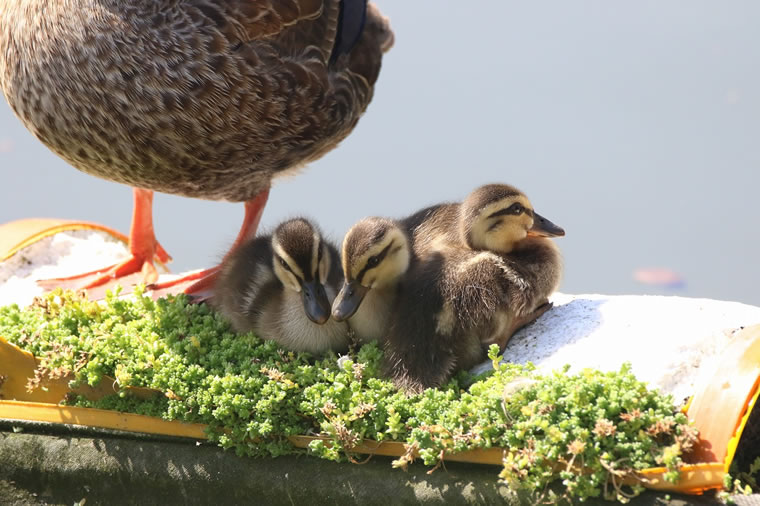 お母さんの足元で、可愛いヒナたちが日向ぼっこをしていました!