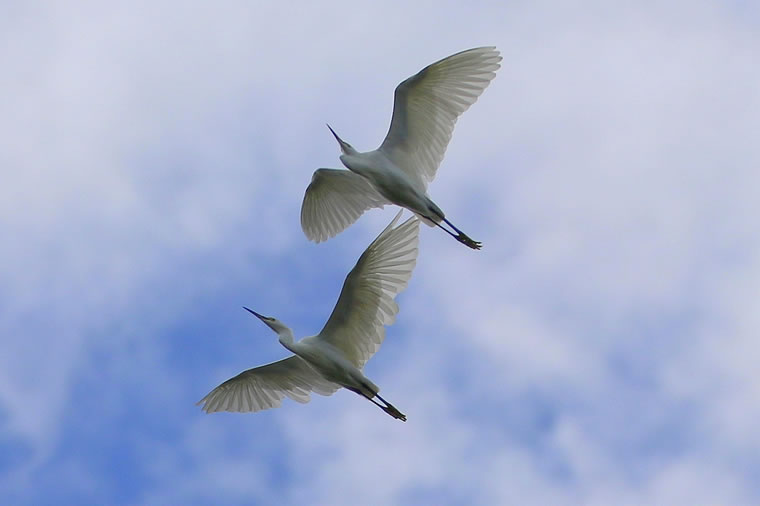 秋晴れの日、天高く2羽のコサギが優雅に通過していきました。