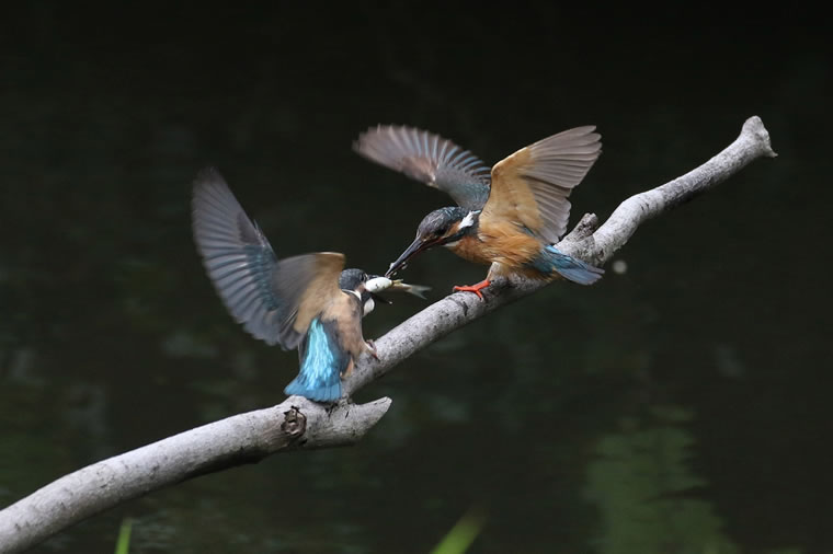 親(右)が幼鳥(左)に魚を与えています。