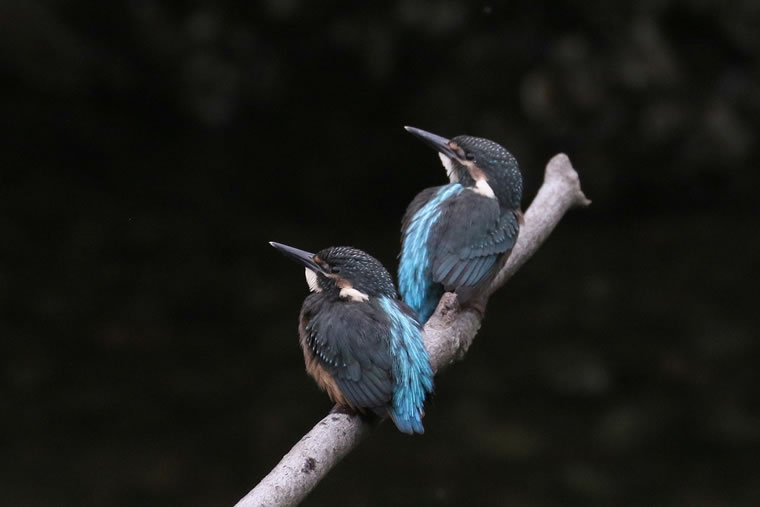 巣から出た幼鳥2羽が同じ枝に止まり、同じ方向を眺めていました。