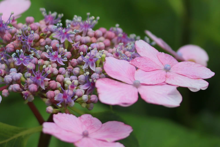 写真右の花びらのように見えるものは「ガク」(装飾花(そうしょくか))で、実際の花「真花」の 部分は中央~左にあるごく小さなところです。