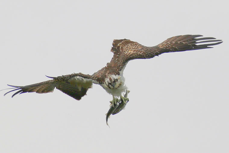 2匹の獲物を掴んでいるミサゴの正面写真を初めて撮ることができました! 羽根がうねっていて、迫力倍増です。