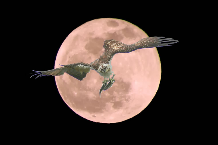 写真ソフトを使って、#8 のダブルゲットのミサゴを切り取り、満月を背景に合成したお遊び pic です。