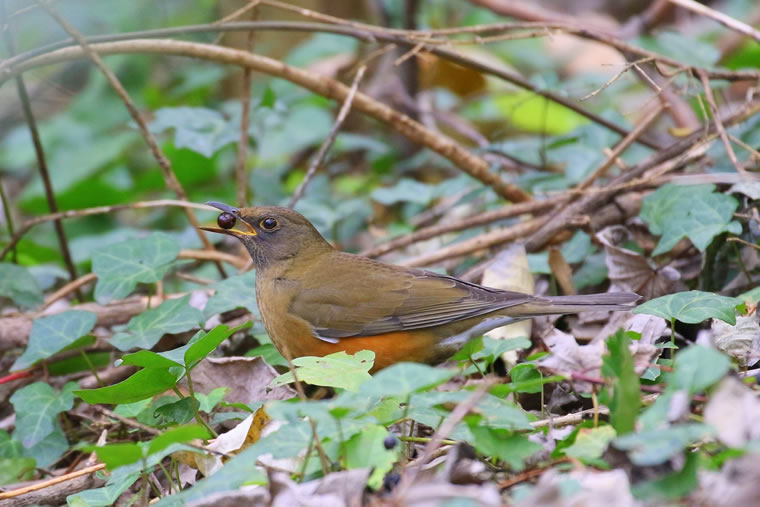 鳥はその形や色から名づけられたものが多く、アカハラも、その胸から腹への赤味がかった橙々(ダイダイ)色からの命名です。