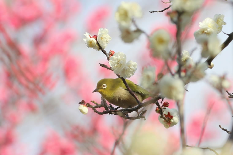 メジロ、白梅、紅梅を1枚の写真に入れたくて、いろいろな角度から撮り、何とか狙い通りの写真を数枚撮ることができました。