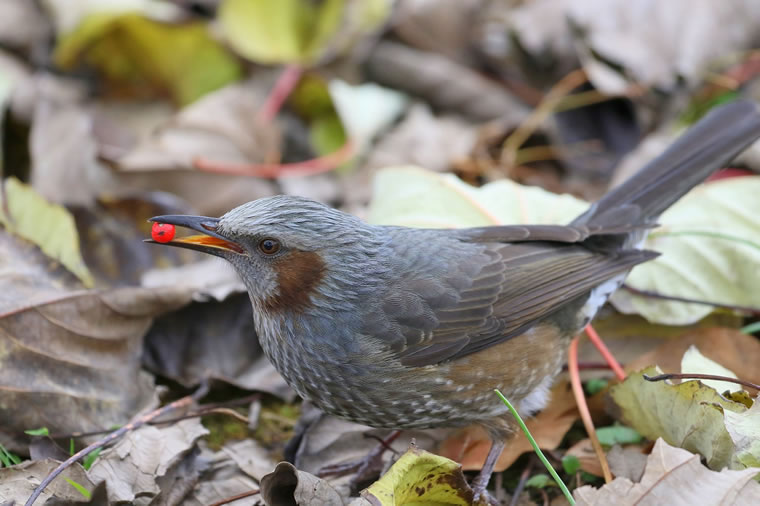 花の蜜や果実が大好物ですが、地面に落ちたイイギリの赤い実を探しては丸呑みしていました。