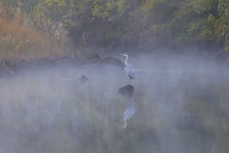 早朝にカワセミ公園に行ってみたら、水面がもやっていて、アオサギが1羽佇んでいました。