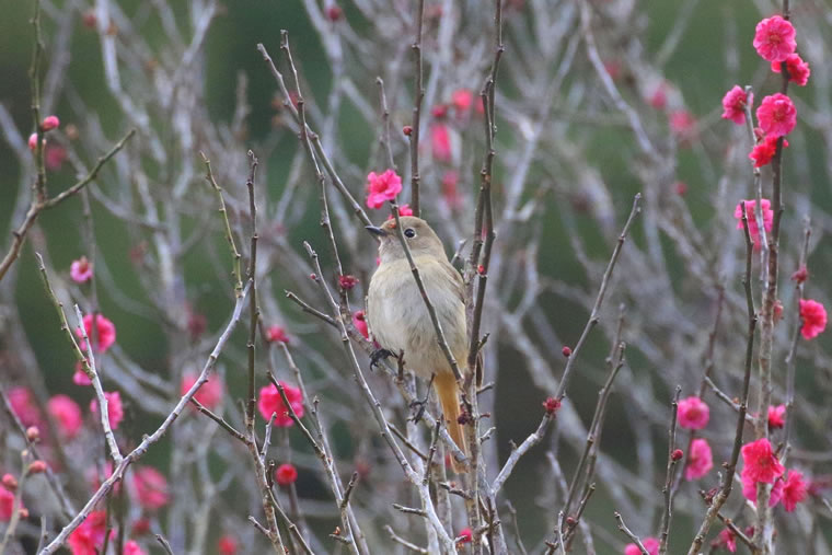 紅梅の鮮やかな色が気に入っているようなジョウビタキさん!