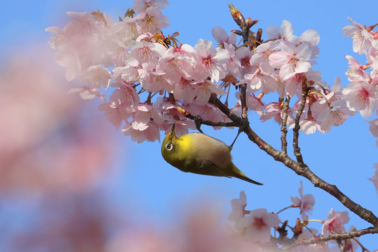 周辺の梅は終わりに近く、河津桜も散り始め、ソメイヨシノはまだまたということで、この1本だけが花満開なので、多くのメジロが次々に蜜を吸いにやってきます。
