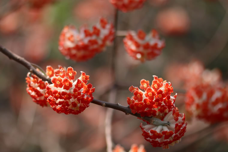 原種は、三つ叉(また)に分かれた枝の先に黄色い花を咲かせますが、この写真のミツマタはオレンジ色から朱色の花を付ける赤花三椏(あかばな みつまた)と称する園芸種のようです。