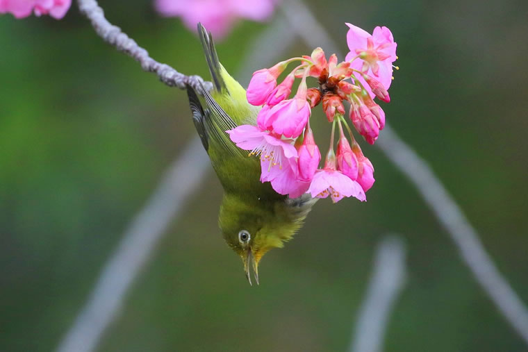 3月上旬に咲いている桜は、この辺りでは横浜緋桜だけで、数が少ないので、多くのメジロが蜜を吸いにやってきます。