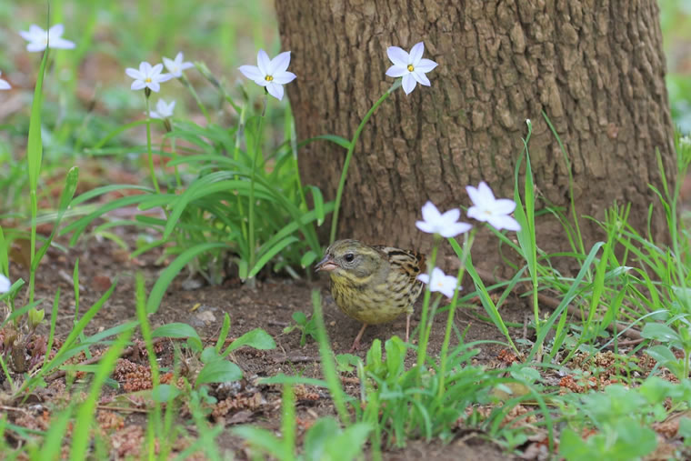 桜と同じ時期に咲きだすハナニラを見ていたら、アオジが来てくれました。