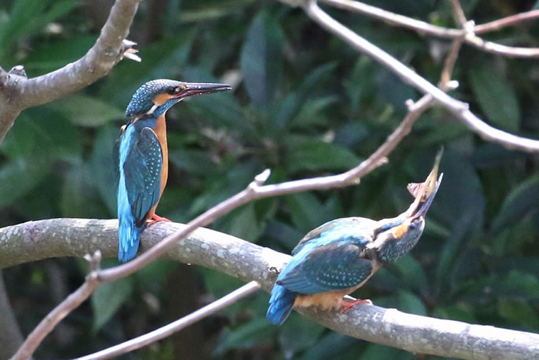 差し出した獲物をメスが受け取ってくれて、オス(左)は得意そうなポースを撮っているように見えます。