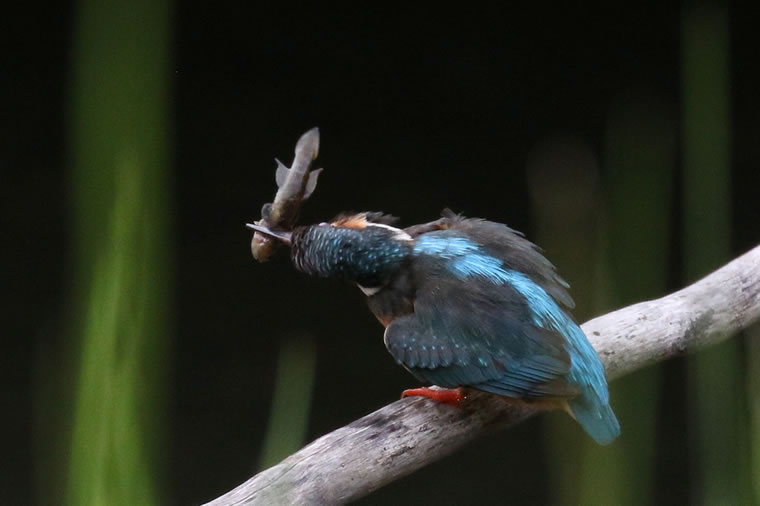 生きのよい獲物をそのまま飲み込むと、カワセミのお腹の中で暴れまわるので、枝に叩きつけてしっかり〆てから、丸呑みします。