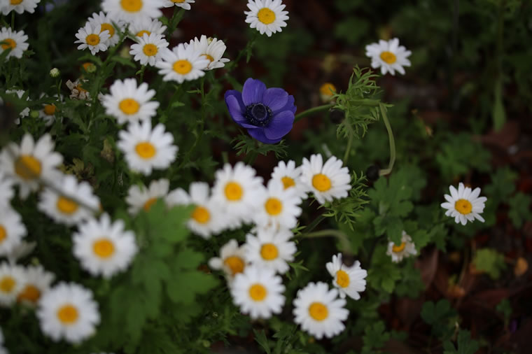 近所の花壇で見つけたアネモネの回りに咲いているのはマーガレットでしょうか?!