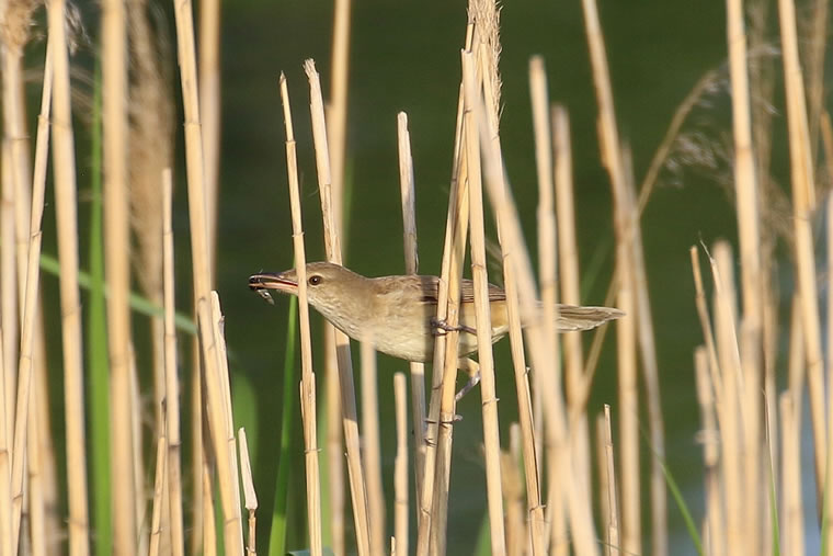 鳴いていたオオヨシキリが空中に飛び上がったと思ったら、虫を捕まえて咥えていました。