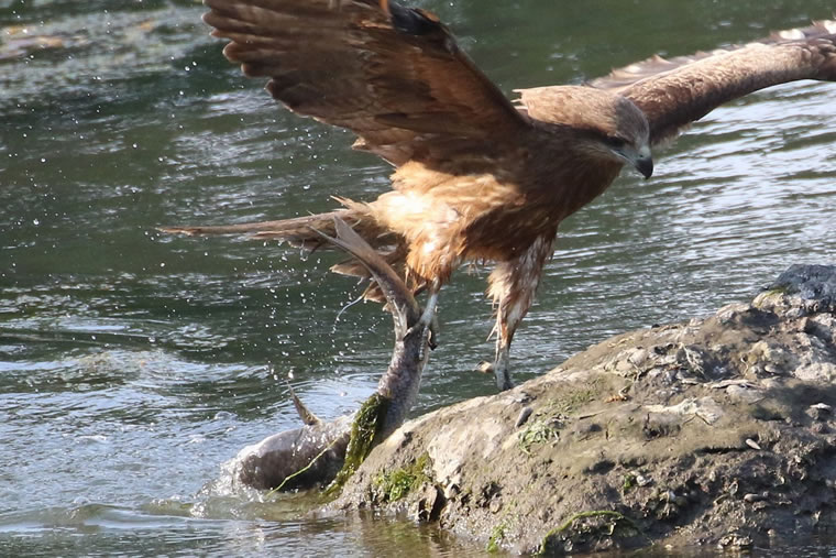 いつものカワセミ公園でカワセミを待っていたら、珍しくトビが近くに降りてきて、羽ばたいて水に脚をいれたと思ったら、大きな魚を掴んでいました!