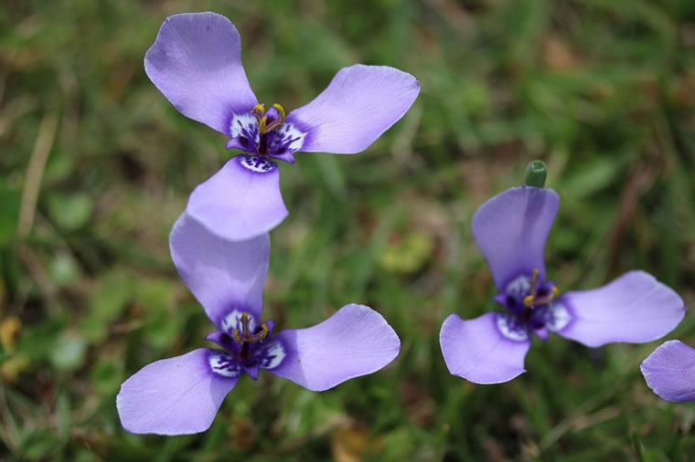 チリアヤメは、芝生の中などで散らばるように点々と可憐な花を咲かせ、小さいながらも鮮やかな濃いブルーの色がよく目立ちます。