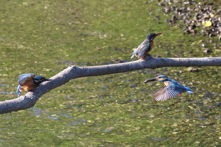 幼鳥(左端)とメス(枝上の右側)が同じ枝に止まっていると、そこにオス(右端)が小魚を咥えてやってきました。