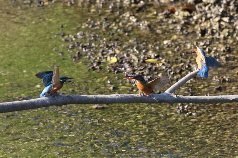 まだ、残念がっている幼鳥(左端)に、お母さんは「お魚は、もう自分で捕りなさいね!」といっているようです。