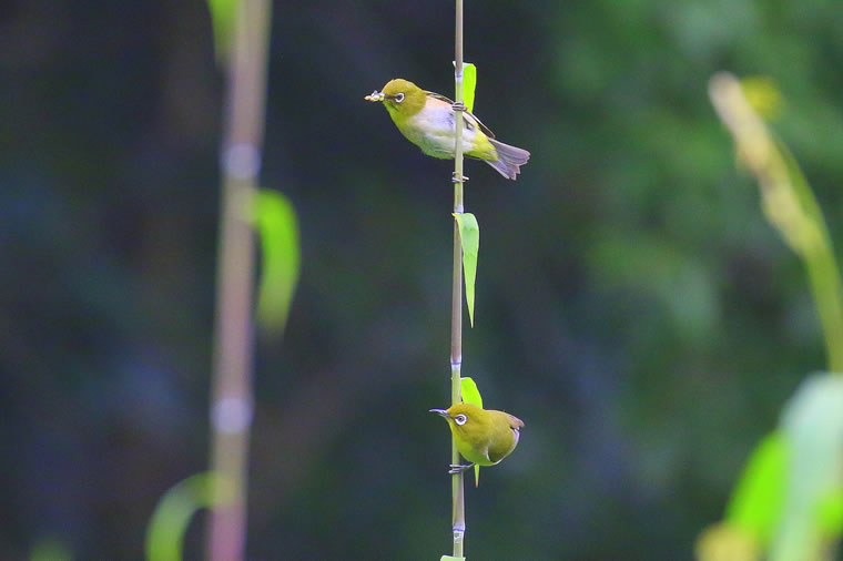 笹の枝に、こんなポーズで止まったメジロさんは初めて見ました。