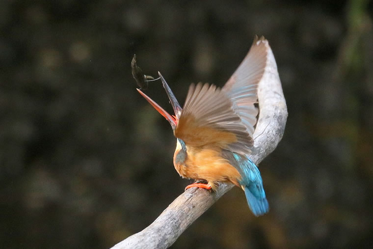 お母さんカワセミが、捕えた獲物を空中で咥え直す瞬間です。