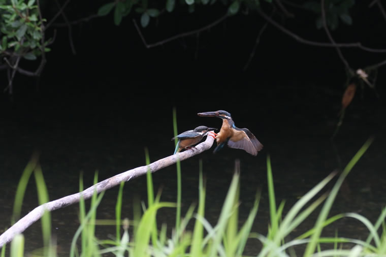 幼鳥が止まっている枝に獲物を咥えたお母さんカワセミが着地!