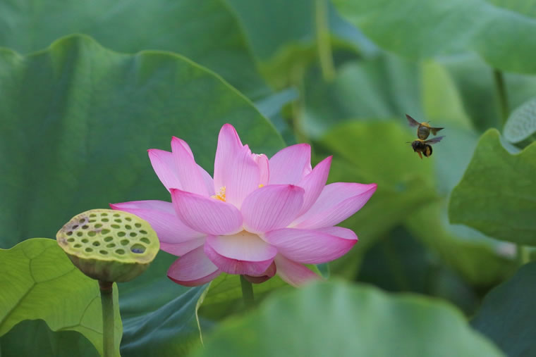 ハスの花の右に写っているのはクマバチでしょうか!?