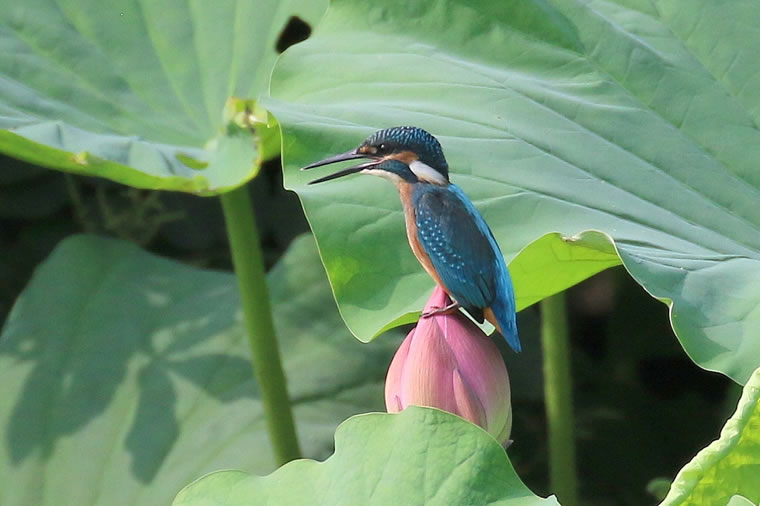 ハスの蕾のほうが、カワセミにとっては止まりやすいのでしょうね!