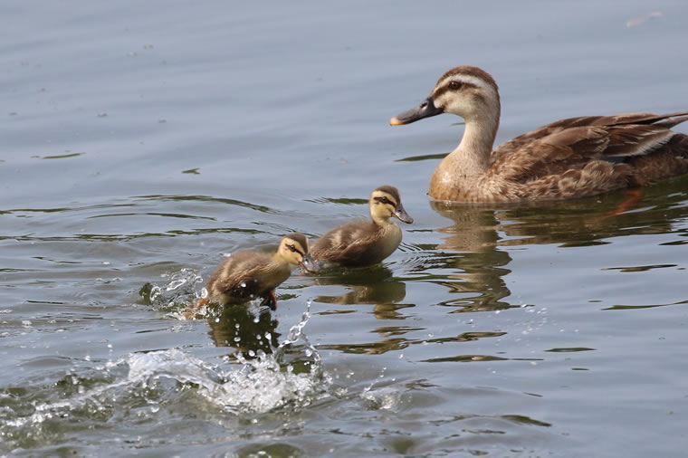 カルガモ親子が、ゆったりと泳いでいたら、すぐ近くで魚が跳びはね、幼鳥さんがこれに驚いて飛び上がりました!