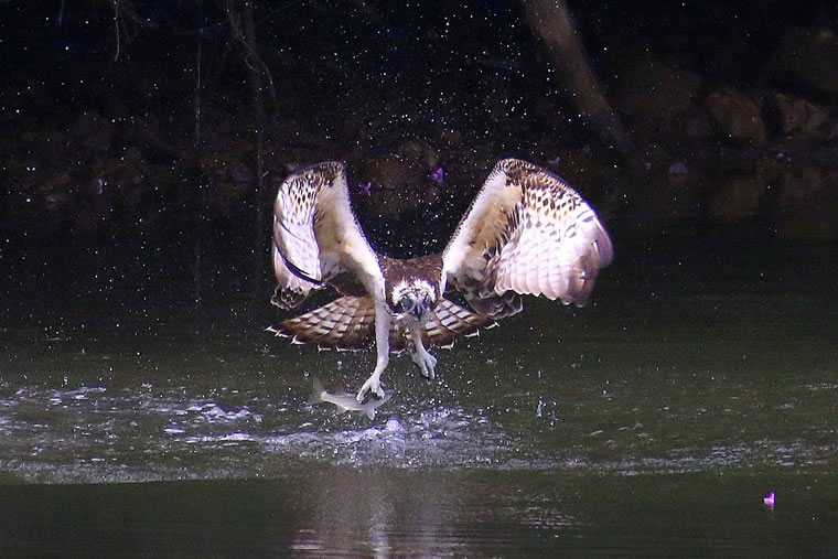 力強い羽ばたきで水面から飛び出すと、右足にしっかり魚をつかんでいました。