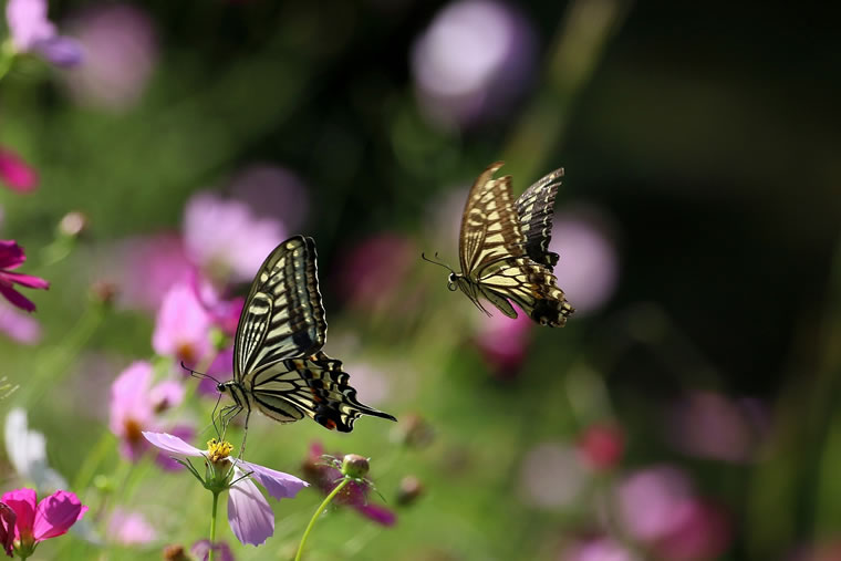 表紙のコスモスを眺めていたら、アゲハチョウ(ナミアゲハ)が2匹近づいてきました。