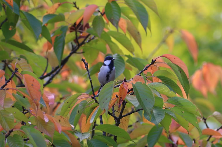 白黒の地味なジジュウカラも、色づいたオオシマザクラの葉の合間に止まると絵になります。