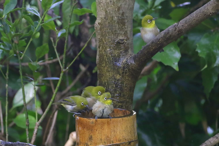 竹筒で作った水飲み場の水が少なくなっていたので、水を継ぎ足してしばらくすると、メジロの声がしたので、そっと近づいていくと、水浴びの行列を作っていました。